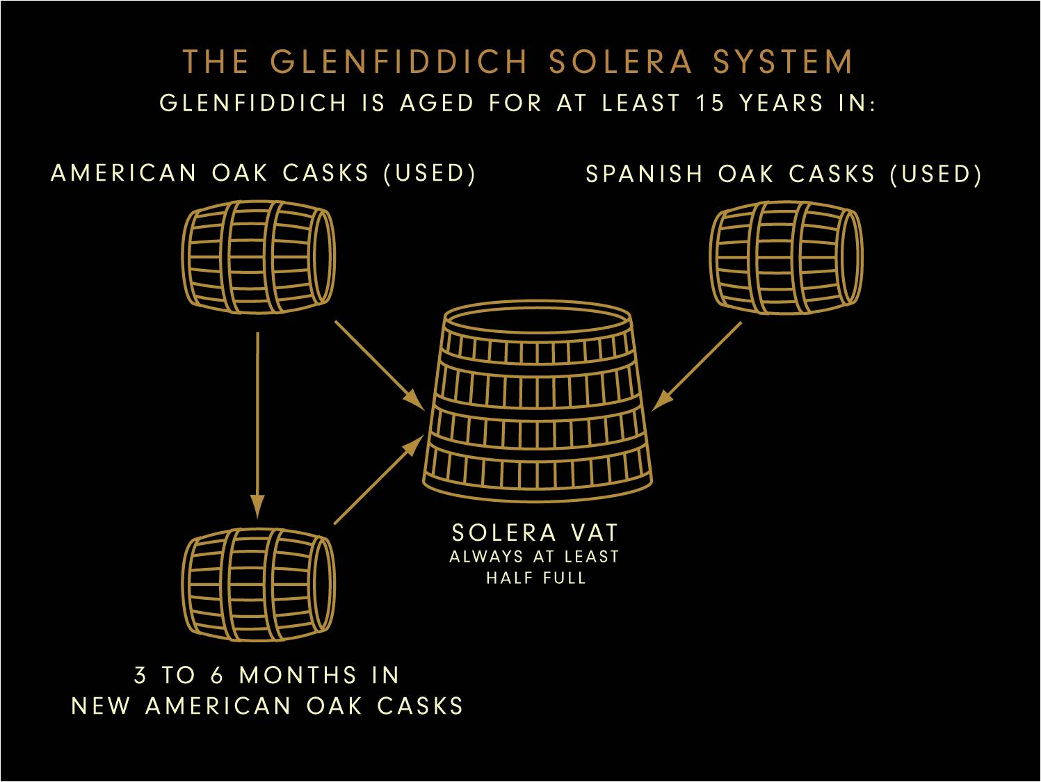 Esasen şarap,şeri, rom,brendi ve hatta bira alkollerinde sıkça rastladığımız olgunlaştırma tekniği olan solerayı viski üretimine uyarlayan Brian Kinsman’a selam ve saygımızı belirterek başlayalım paragrafımıza. Tekniğin asıl amacı farklı yıllardaki viskileri harmanlayıp çok daha zengin bir hale sokmak , lezzet derinliğini arttırmak. 15 yıl boyunca burbon, şeri ve yeni meşe fıçılarında bekletildikten sonra , viskimiz devasa solera tankına giriyor ve her defasında fıçının yarısı boşaltılarak şişelenmeye götürülüyor ve fıçının boşalan yarısına yine 15 yıllık olgunlaşma sürecini tamamlamış viskiler katılıp önceden duran viskiyle evlendiriliyor. Tankımız elbetteki meşeden oluşuyor ve tam 37.000 litre. İşte bu solera tankında geçirilen bu muhteşem birkaç ay viskimizin esas karakterini oluşturuyor. 1998 yılından itibaren yarısı hiç boşalmayan bu solera fıçısısayesinde her yıl farklı bir zenginlik almanız mümkün ve teknik olarak bugün içtiğimiz Glenfiddich 15 in içinde 1 damla dahi olsa 1998 yılından esintiler var.